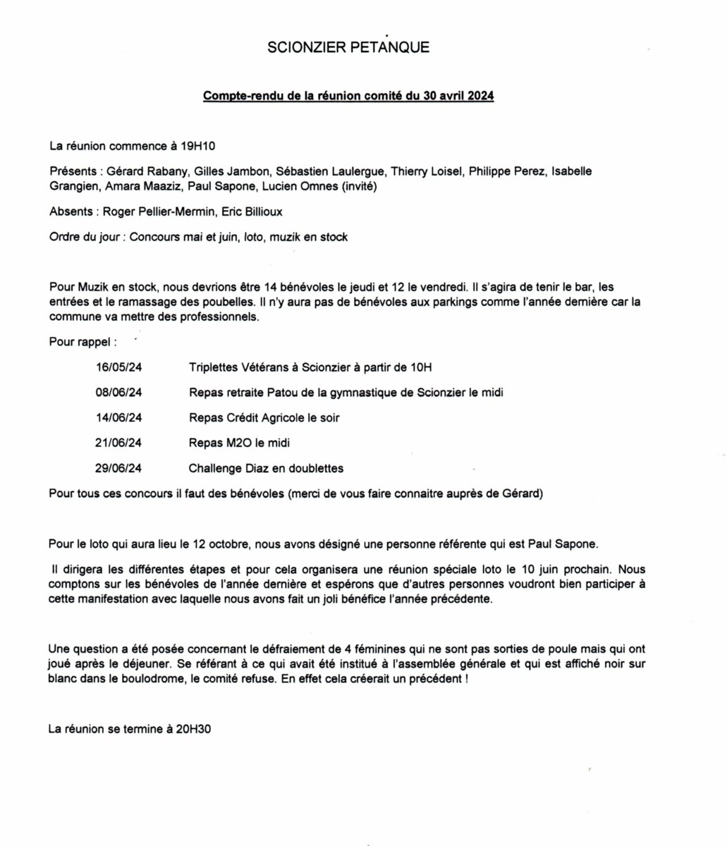 REUNION DE COMITE DU 30 AVRIL 2024